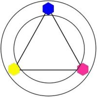 Les couleurs qui se trouvent opposées dans le cercle chromatique sont appelées couleurs complémentaires. Par exemple, la couleur complémentaire du rouge est le vert (obtenu en mélangeant les deux autres couleurs primaires, le jaune et le bleu (cyan)). La complémentaire du bleu est l’orangé (mélange de jaune et de rouge (magenta)), et la complémentaire du jaune est le violet (mélange de bleu (cyan) et rouge (magenta)).